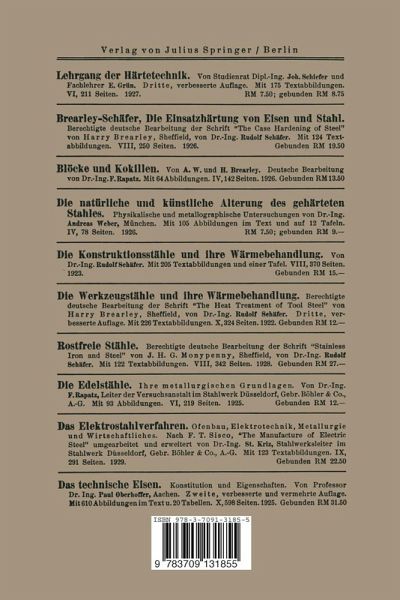 I. Geschichtlicher Rückblick.- II. Eigenschaften des Stahls.- 1. Roheisen und Stahl.- 2. Mechanische und physikalische Eigenschaften.- 3. Festigkeitsgrößen bei ruhender Belastung.- 4. Festigkeitsgrößen bei wechselnder, schwingender und stoßartiger Belastung.- 5. Härte und Härteprüfung.- 6. Einfluß des Kohlenstoffgehaltes auf die Festigkeitsgütewerte von Stahl.- 7. Bedeutung der mechanischen Gütewerte für die Konstruktion.- 8. Bedeutung der mechanischen Gütewerte für die Werkstatt.- III. Einteilung der Stähle.- 9. Gewöhnliche und Edelstahle.- 10. Legierte und unlegierte Stähle.- 11. Baustähle und Werkzeugstähle.- IV. Gefügeaufbau des Stahls.- A. Kristall und Raumgitter.- B. Gefügeaufbau der Eisen-Kohlenstoff-Legierung nach langsamem Abkühlen.- V. Glühen des Stahls.- 23. Einfluß des Glühens auf das Gefüge.- 24. Zweck des Glühens.- 25. Richtiges Glühen.- 26. Fehler beim Glühen.- VI. Härten und Vergüten.- A. Bedeutung und Einfluß auf die mechanischen Gütewerte.- B. Änderungen im Gefügeaufbau durch rasches Abkühlen und Anlassen.- VII. Einsatzhärten.- A. Härten durch Zementieren.- B. Härten durch Nitrieren.- VIII. Legierte Stähle.- A. Legierte Stähle im allgemeinen.- B. Legierte Baustähle.- C. Legierte Werkzeugstähle.- IX. Formänderungen und Spannungen.- A. Volumänderungen.- B. Spannungen und Formänderungen infolge von Temperaturunterschieden.- C. Spannungen und Formänderungen unter Berücksichtigung der Gefügeänderung.