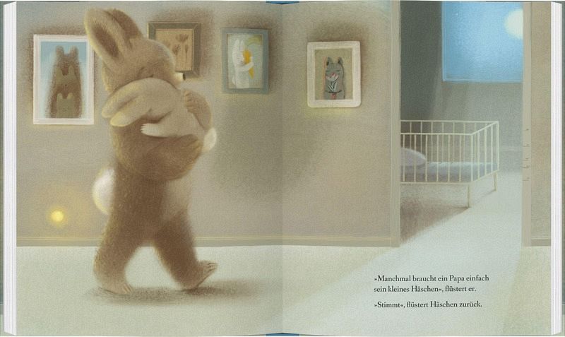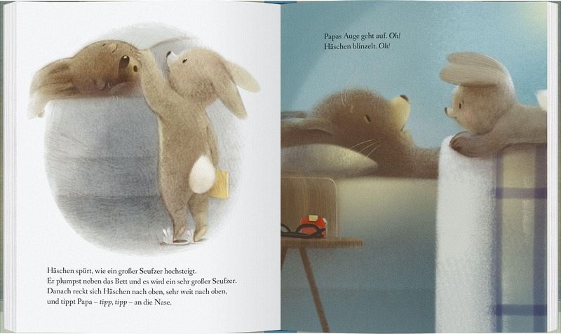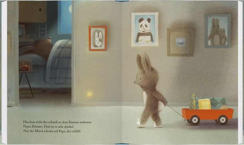Die Zeichnungen laden Kinder dazu ein, genau hinzuschauen und kleine Details zu entdecken – etwa die Kekse, die Decke oder Häschen, das mit leuchtenden Augen auf Papa wartet.
