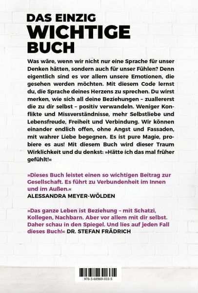 Denn: Wer in Kontakt mit seinem Inneren ist, wer in der Lage ist, sein Gefühlsleben wertzuschätzen und auszudrücken, hat die glücklicheren Beziehungen, egal ob zu anderen oder zu sich selbst. Schlüssel ist das Erlernen des positiven Selbstgesprächs: Wir können uns darin trainieren, unsere Gefühle wahrzunehmen, sie in Worte zu fassen und zu kommunizieren, egal ob an uns selbst oder an andere. Und das, ohne uns verletzlich dabei zu fühlen, sondern vielmehr selbstbewusst und voller Selbstliebe. Wenn uns das gelingt, haben wir den Beziehungscode geknackt und unser Leben richtet sich wie von magischer Hand ins Positive aus. Ohne Scheiß: Euer Leben wird sich wundervoll verändern!