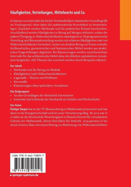 In diesem essential steht die leichte Verständlichkeit statistischer Grundbegriffe im Vordergrund, ohne dabei die mathematische Korrektheit zu beeinträchtigen. Zunächst werden Merkmale und ihr praktischer Einsatz beschrieben. Anschließend werden Häufigkeiten in Bezug auf Mengen definiert, sodass der spätere Übergang zu Wahrscheinlichkeiten naheliegend ist. Hypergeometrische Verteilung und Binomialverteilung werden mit relativen Häufigkeiten statt mit Wahrscheinlichkeiten formuliert, sodass ein direkter Bezug zur Praxis entsteht. Arithmetisches, geometrisches und harmonisches Mittel werden aus praktischen Fragestellungen abgeleitet. Bei Klassierungen werden unverbesserbare Intervalle für das arithmetische Mittel ohne die üblichen spekulativen Annahmen hergeleitet. Alle Themen des essentials werden durch Beispiele erläutert.