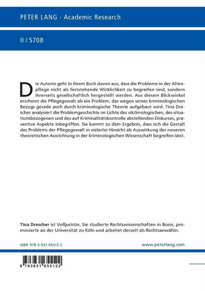 Die Autorin geht in ihrem Buch davon aus, dass die Probleme in der Altenpflege nicht als feststehende Wirklichkeit zu begreifen sind, sondern ihrerseits gesellschaftlich hergestellt werden. Aus diesem Blickwinkel erscheint die Pflegegewalt als ein Problem, das wegen seines kriminologischen Bezugs gerade auch durch kriminologische Theorie aufgebaut wird. Tina Drescher analysiert die Problemgeschichte im Lichte des viktimologischen, des situationsbezogenen und des auf Kriminalitätskontrolle abstellenden Diskurses, präventive Aspekte inbegriffen. Sie kommt zu dem Ergebnis, dass sich die Gestalt des Problems der Pflegegewalt in vielerlei Hinsicht als Auswirkung der neueren theoretischen Ausrichtung in der kriminologischen Wissenschaft begreifen lässt.