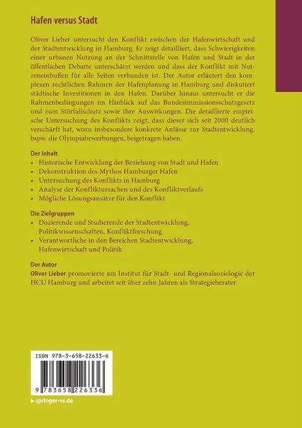 Oliver Lieber untersucht den Konflikt zwischen der Hafenwirtschaft und der Stadtentwicklung in Hamburg. Er zeigt detailliert, dass Schwierigkeiten einer urbanen Nutzung an der Schnittstelle von Hafen und Stadt in der öffentlichen Debatte unterschätzt werden und dass der Konflikt mit Nutzeneinbußen für alle Seiten verbunden ist. Der Autor erläutert den komplexen rechtlichen Rahmen der Hafenplanung in Hamburg und diskutiert städtische Investitionen in den Hafen. Darüber hinaus untersucht er die Rahmenbedingungen im Hinblick auf das Bundesimmissionsschutzgesetz und zum Störfallschutz sowie ihre Auswirkungen. Die detaillierte empirische Untersuchung des Konflikts zeigt, dass dieser sich seit 2000 deutlich verschärft hat, wozu insbesondere konkrete Anlässe zur Stadtentwicklung, bspw. die Olympiabewerbungen, beigetragen haben.