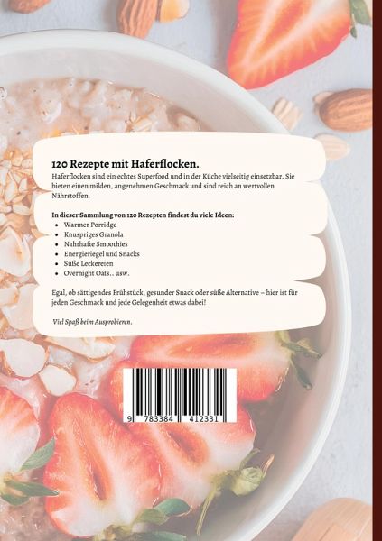 120 Rezepte mit Haferflocken.Haferflocken sind ein echtes Superfood und in der Küche vielseitig einsetzbar. Sie bieten einen milden, angenehmen Geschmack und sind reich an wertvollen Nährstoffen.In dieser Sammlung von 120 Rezepten findest du viele Ideen:oWarmer PorridgeoKnuspriges GranolaoNahrhafte SmoothiesoEnergieriegel und SnacksoSüße LeckereienoOvernight Oats.. usw.Egal, ob sättigendes Frühstück, gesunder Snack oder süße Alternative - hier ist für jeden Geschmack und jede Gelegenheit etwas dabei!Viel Spaß beim Ausprobieren.