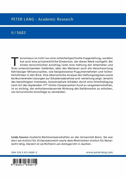Terrorismus ist nicht nur eine sicherheitspolitische Fragestellung, sondern hat auch eine privatrechtliche Dimension, der dieses Werk nachgeht. Bei einem terroristischen Anschlag rückt eine Haftung der Attentäter und ihres unterstützenden Umfeldes, aber des Weiteren auch die Verantwortung fahrlässiger Mitverursacher, wie beispielsweise Flugunternehmen und Sicherheitsfirmen in den Blick. Eine ökonomische Analyse des Haftungsregimes sowie konkurrierender Lösungen zur Schadensabnahme und -verteilung zeigt: Jenseits des berechtigten Interesses, katastrophale Schäden durch eine Entschädigung nach Art des September 11th Victim Compensation Fund zu vergemeinschaften, ist es wichtig, die verhaltenssteuernde Wirkung des Deliktsrechts zu erhalten, um terroristische Anschläge zu vermeiden.