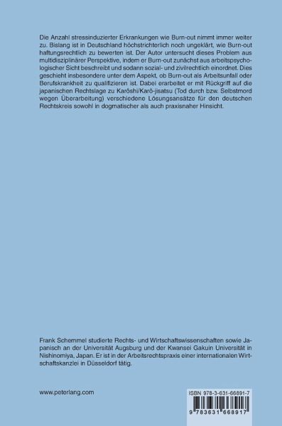 Die Anzahl stressinduzierter Erkrankungen wie Burn-out nimmt immer weiter zu. Bislang ist in Deutschland höchstrichterlich noch ungeklärt, wie Burn-out haftungsrechtlich zu bewerten ist. Der Autor untersucht dieses Problem aus multidisziplinärer Perspektive, indem er Burn-out zunächst aus arbeitspsychologischer Sicht beschreibt und sodann sozial- und zivilrechtlich einordnet. Dies geschieht insbesondere unter dem Aspekt, ob Burn-out als Arbeitsunfall oder Berufskrankheit zu qualifizieren ist. Dabei erarbeitet er mit Rückgriff auf die japanische Rechtslage zu Karôshi/Karô-jisatsu (Tod durch bzw. Selbstmord wegen Überarbeitung) verschiedene Lösungsansätze für den deutschen Rechtskreis sowohl in dogmatischer als auch praxisnaher Hinsicht.