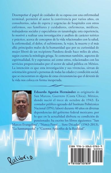 Desempeñar el papel de cuidador de su esposa con una enfermedad terminal, permitió al autor la convivencia por varios años, en consultorios, salas de espera y urgencias de hospitales con otros enfermos, sus familiares y cuidadores, enfermeras, médicos, trabajadoras sociales y especialistas en tanatología; esta experiencia, lo motivó a realizar una investigación y análisis de carácter teórico y práctico, acerca de conceptos de la vida relacionados con la salud, la enfermedad, el dolor, el sufrimiento, la vejez, la muerte y el más allá; principales males de la humanidad que por su curiosidad de mujer liberó de un recipiente Pandora desde hace miles de años, según cuenta la mitología griega. Se comentan también, aspectos de espiritualidad, fe y esperanza; así como otros, relacionados con los servicios proporcionados por el sector de salud pública en México. La intención es que esta investigación y sus vivencias, sirvan de orientación general a personas de todas las edades y condición social, que se encuentran en alguna de estas circunstancias que el devenir de la vida nos coloca en forma inesperada.
