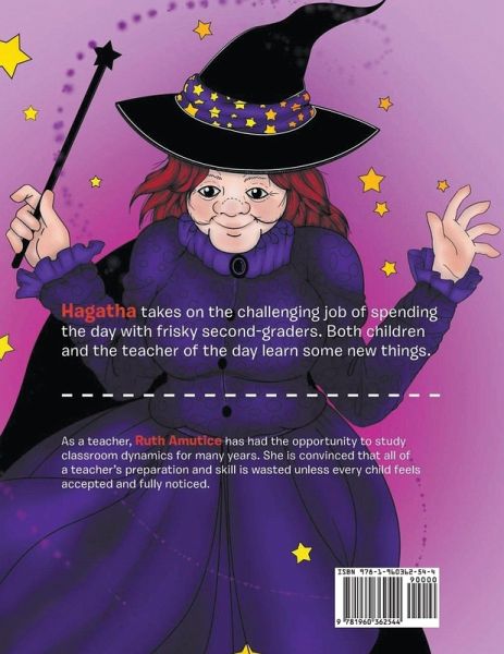 Hagatha takes on the challenging job of spending the day with frisky second-graders. Both children and the teacher of the day learn some new things. She had to do this in a hurry! ZING! Hagatha's straight red hair flew up into a neat bun at the top of her head. ZAP! Her orange and green stockings became a long-sleeved blouse. Poof! The ragged black cape became a neatly-fitting suit. Her buckled shoes stayed the same, but the pointed hat became a fashionable tote. Hagatha had shape-shifting talents.