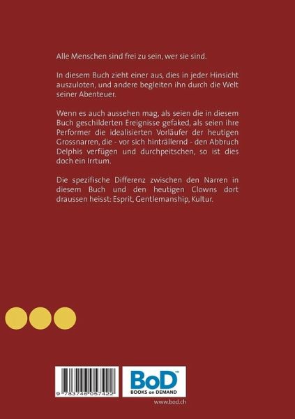 Alle Menschen sind frei zu sein, wer sie sind. In diesem Buch zieht einer aus, dies in jeder Hinsicht auszuloten, und andere begleiten ihn durch die Welt seiner Abenteuer.Wenn es auch aussehen mag, als seien die in diesem Buch geschilderten Ereignisse gefaked, als seien ihre Performer die idealisierten Vorläufer der heutigen Großnarren, die - vor sich hinträllernd - den Abbruch Delphis verfügen und durchpeitschen, so ist dies doch ein Irrtum. Die spezifische Differenz zwischen den Narren in diesem Buch und den heutigen Clowns dort draußen heißt: Esprit, Gentlemanship, Kultur.