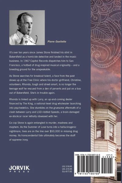 It's over ten years since James Stone finished his stint in Bakersfield, California as a homicide detective and landed in the music business, where his golden ear serves him well. In 1967 Capital Records dispatches him to San Francisco, a hotbed of drug-inspired musical originality - and a breeding ground for the unspeakable. Also exploring new business opportunities here is The King, a national-level drug trader keen to break into psychedelics. He has a flair for recruiting new talent, providing financing, and dealing imaginatively with competitors like acid kingpin Superspade. As Stone searches for breakout talent, a face from the past shows up at the Free Clinic where his doctor girlfriend, Christine, volunteers. Rhonda, tough and street-smart, is no longer the waif he rescued from a den of perverts and put on a bus out of Bakersfield ten years ago. She's in trouble again. Rhonda is linked up with Larry, an up-and-coming acid dealer financed by The King. She stumbles on the gruesome aftermath of a clash between Larry and LSD-riddled Speedo, a brain-damaged ex-stockcar racer lethally obsessed with her. Meanwhile, hiding among the hippies is an angry battle-haunted Vietnam vet with explosive skills, just waiting for his moment. Ex-cop Stone is again entangled in murder, madness and mayhem. As the Summer of Love turns into a hallucinogenic nightmare, lives are on the line over $50,000 in missing drug money. Its transcendental fate ultimately becomes the stuff of supreme irony.