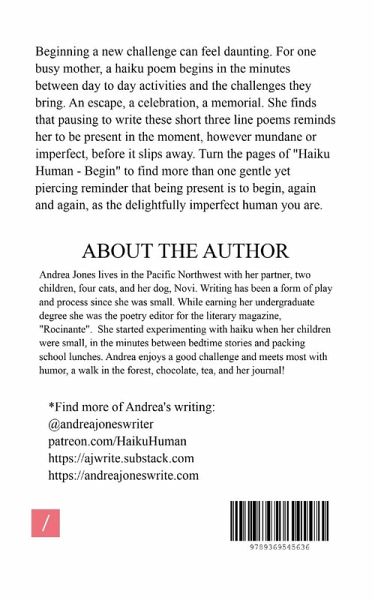 Beginning a new challenge can feel daunting. For one busy mother, a haiku poem begins in the minutes between day to day activities and the challenges they bring. An escape, a celebration, a memorial. She finds that pausing to write haiku, short three line poems, reminds her to be present in the moment, however mundane or imperfect, before it slips away. Turn the pages of "Haiku Human - Begin" where you'll find more than one gentle yet piercing reminder that being present is to begin, again and again, as the delightfully imperfect human you are.