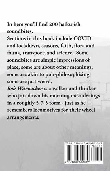 A collection of 200 poems in more or less haiku form, many from living and walking around the Longdendale area in High Peak, Derbyshire. Sections in this book include COVID and lockdown, seasons, faith, flora and fauna, transport; and science. Some are simple impressions of place, some are about other meanings, some are akin to pub-philosophising, some are a little weird.