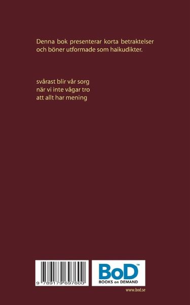 Denna bok presenterar korta betraktelser och böner utformade som haikudikter. svårast blir vår sorg när vi inte vågar tro att allt har mening
