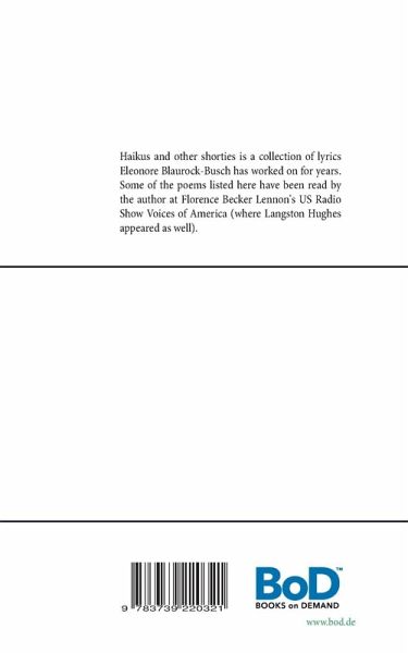 Haikus and other shorties is a collection of lyrics Eleonore Blaurock-Busch has worked on for years. Some of the poems listed here have been read by the author at Florence Becker Lennon's US Radio Show Voices of America (where Langston Hughes appeared as well).