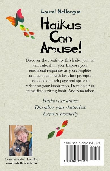 Discover the creativity this haiku journal will unleash in you! Explore your emotional responses as you complete unique poems with first line prompts provided on each page and space to reflect on your inspiration. There are 366 pages (because every year should have an extra day!) numbered simply 1-366 with space for you to fill in your own day and date (because you don't need the stress of a daily requirement). Use the first line of 5 syllables to inspire a thought or memory, and then complete the haiku on the next two lines with 7 syllables on the middle line and 5 syllables on the last line. There's no need to consider rhyme at all. Some of the starters are quite silly (haiku can amuse), but some may take you to poignant places. In some cases, your haiku starter is just one five-syllable word, so don't let that throw you. As with other multi-word starters, think about the word and what it might mean to you. Don't worry about punctuation, and don't think that each line should be a complete sentence; your whole poem might be a single seventeen-syllable sentence. Your last line may come as a surprise to you. If it does, you've captured a more complex essence of haiku! On every 10th page you'll find a vague TOPIC suggestion instead of a completed first line. These pages are designed to give you complete creative freedom for the full 17 syllables. Once you've completed your haiku, spend just a few minutes jotting down (in narrative form, as you would in a journal) what inspired your haiku. Allow yourself to laugh or cry or wonder. Haiku can provoke powerful emotions. Go ahead and doodle in the margins if you'd like! This is your workbook. At the end of the book you'll find complete examples of haiku written by guest contributors. If the 366 pages in this journal just aren't enough for you, feel free to use some of their first lines-or last lines-to start your own unique poem. Develop a fun, stress-free writing habit. And remember: Haikus can amuse Discipline your chatterbox Express succinctly!