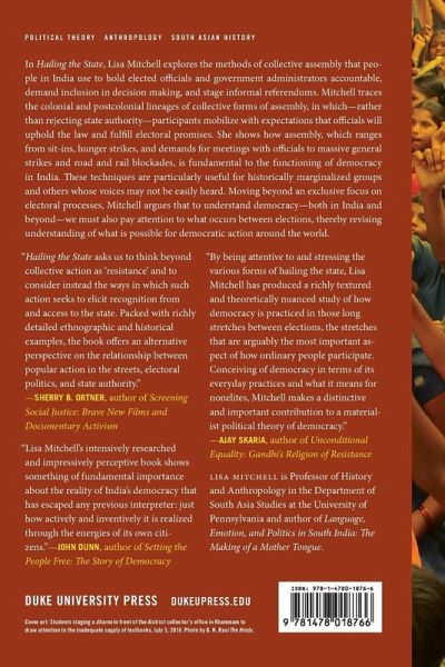 In Hailing the State, Lisa Mitchell explores the methods of collective assembly that people in India use to hold elected officials and government administrators accountable, demand inclusion in decision making, and stage informal referendums. Mitchell traces the colonial and postcolonial lineages of collective forms of assembly, in which-rather than rejecting state authority-participants mobilize with expectations that officials will uphold the law and fulfill electoral promises. She shows how assembly, which ranges from sit-ins, hunger strikes, and demands for meetings with officials to massive general strikes and road and rail blockades, is fundamental to the functioning of democracy in India. These techniques are particularly useful for historically marginalized groups and others whose voices may not be easily heard. Moving beyond an exclusive focus on electoral processes, Mitchell argues that to understand democracy-both in India and beyond-we must also pay attention to what occurs between elections, thereby revising understanding of what is possible for democratic action around the world.