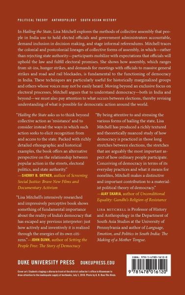 In Hailing the State, Lisa Mitchell explores the methods of collective assembly that people in India use to hold elected officials and government administrators accountable, demand inclusion in decision making, and stage informal referendums. Mitchell traces the colonial and postcolonial lineages of collective forms of assembly, in which-rather than rejecting state authority-participants mobilize with expectations that officials will uphold the law and fulfill electoral promises. She shows how assembly, which ranges from sit-ins, hunger strikes, and demands for meetings with officials to massive general strikes and road and rail blockades, is fundamental to the functioning of democracy in India. These techniques are particularly useful for historically marginalized groups and others whose voices may not be easily heard. Moving beyond an exclusive focus on electoral processes, Mitchell argues that to understand democracy-both in India and beyond-we must also pay attention to what occurs between elections, thereby revising understanding of what is possible for democratic action around the world.