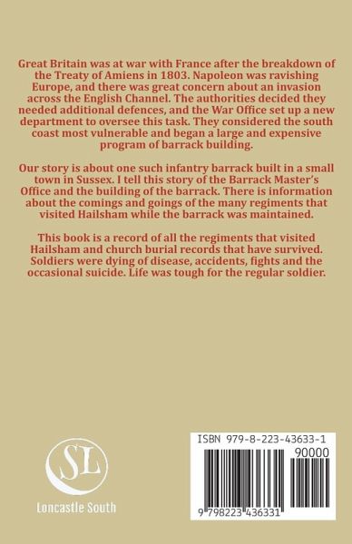 Great Britain was at war with France after the breakdown of the Treaty of Amiens in 1803. Napoleon was ravishing Europe and there was great concern about an invasion across the English Channel. The authorities decided that they needed additional defences and a new department was set up by the War Office. They considered the south coast most vulnerable and began a large and expensive program of barrack building. This is a story about one such infantry barrack built in a small town in Sussex. I tell this story of the Barrack Master's Office and the building of the barrack. There is information about the comings and goings of the many regiments that visited Hailsham while the barrack was maintained. After the defeat of Napoleon many barracks along the southern counties were closed. This is a record of all the regiments that visited along with church burial records that have survived. Soldiers were dying of disease, accidents, fights and the occasional suicide. Life was very difficult for the regular soldier.
