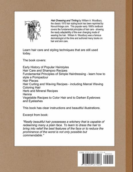 Hair Dressing and Tinting by William A. Woodbury, the classic 1915 hair styling book has been reprinted by NovusVintage.com. This popular early 1900's textbook covers the fundamental principles of hair care - showing the ready adaptability of the ever changing mode of wearing the hair. William A. Woodbury was a famous dermatologist at the time and authored many books on hair and skin care. Learn hair care and styling techniques that are still used today - Early History of Popular Hairstyles; Hair Care and Shampoo Recipes; Fundamental Principles of Simple Hairdressing - learn how to style a Pompadour; Hair Pieces; Hair Curling and Waving Recipes - including Marcel Waving; Coloring Hair; Herb and Mineral Recipes; Henna;Vegetable Recipes to Color Hair and to Darken Eyebrows and Eyelashes; and more. This book has clear instructions and beautiful illustrations.