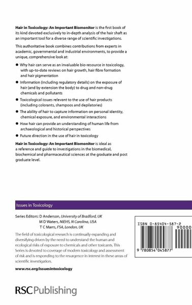 Hair in Toxicology: An Important Biomonitor is the first book of its kind devoted exclusively to in-depth analysis of the hair shaft as an important tool for a diverse range of scientific investigations. This authoritative book combines contributions from experts in academic, governmental and industrial environments, to provide a unique, comprehensive look at: - Why hair can serve as an invaluable bio-resource in toxicology, with up-to-date reviews on hair growth, hair fibre formation and hair pigmentation - Information (including regulatory details) on the exposure of hair (and by extension the body) to drug and non-drug chemical and pollutants - Toxicological issues relevant to the use of hair products (including colourants, shampoos and depilatories) - The ability of hair to capture information on personal identity, chemical exposure, and environmental interactions - How hair can provide an understanding of human life from archaeological and historical perspectives - Future direction in the use of hair in toxicology Hair in Toxicology: An Important Biomonitor is ideal as a reference and guide to investigations in the biomedical, biochemical and pharmaceutical sciences at the graduate and post graduate level. Published Reviews: Below is an excerpt taken from a Book Review published in the Journal of Forensic Science. July 2006, Volume 51, No. 4: "Overall, the book is an excellent addition to the library of scientists interested in various areas of hair analysis. Most of the book flows well and is easy to read. There is an extensive index providing easy access to sections of interest, and it will be a useful reference tome for my bookshelf." Christine, Moore, Ph.D.