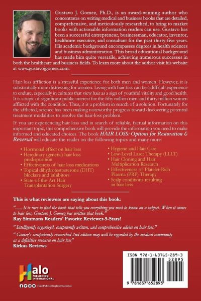 Hair loss affliction is a stressful experience for both men and women. However, it is substantially more distressing for women. Living with hair loss can be a difficult experience to endure, especially in cultures that view hair as a sign of youthful vitality and good health. It is a topic of significant public interest for the fifty million men and thirty million women afflicted with the condition. Thus, it is a problem in search of a solution. Fortunately for the afflicted, science has been making noteworthy progress toward discovering potential treatment modalities to resolve the hair-loss problem. If you are experiencing hair loss and in search of reliable, factual information on this important topic, this comprehensive book will provide the information you need to make informed and educated choices. The book HAIR LOSS: Options for Restoration & Reversal will educate the reader on the following topics and many more: ¿ Hormonal effect on hair loss ¿ Hereditary (genetic) hair loss predisposition ¿ Effectiveness of hair loss medications ¿ Topical dihydrotestosterone (DHT) blockers and inhibitors ¿ State-of-the-Art Hair Transplantation Surgery ¿ Hygiene and Hair Care ¿ Low-Level Laser Therapy (LLLT) ¿ Hair Cloning and Hair Multiplication Research ¿ Effectiveness of Platelet-Rich Plasma (PRP) Therapy ¿ Scalp conditions resulting in hair loss