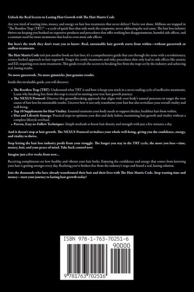 Unlock the Real Secrets to Lasting Hair Growth with The Hair Matrix Code Are you tired of wasting time, money, and energy on hair loss treatments that never deliver? You're not alone. Millions are trapped in "The Rootless Trap (TRT)"-a cycle of quick fixes that only mask the symptoms, never addressing the real cause. The hair loss industry thrives on keeping you hooked on expensive products and procedures that offer nothing but disappointment, harmful side effects, and a constant need for more treatments that lead to even more side effects. But here's the truth they don't want you to know: Real, sustainable hair growth starts from within-without guesswork or endless treatments. The Hair Matrix Code isn't just another book on hair loss; it's a comprehensive guide that cuts through the noise with a revolutionary, science-backed approach to hair regrowth. Forget the costly treatments and risky procedures that only lead to side effects like anxiety and ED, requiring even more treatments. This guide reveals the secrets to breaking free from the traps set by the industry and achieving real, lasting results. No more guesswork. No more gimmicks. Just genuine results. Inside this invaluable guide, you will discover:The Rootless Trap (TRT): Understand what TRT is and how it keeps you stuck in a never-ending cycle of ineffective treatments. Learn why breaking free from this trap is crucial to starting your true hair growth journey. The NEXUS Protocol: Discover this groundbreaking approach that aligns with your body's natural processes to target the root causes of hair loss for sustainable results. Uncover how it not only transforms your hair but also revitalizes your overall vitality and well-being. Top 10 Supplements for Hair Vitality: Essential nutrients your body needs to support thicker, healthier hair from within. Diet and Lifestyle Synergy: Practical steps to optimize your diet and daily habits, maximizing hair growth and vitality without a complete lifestyle overhaul. Proven, Easy-to-Follow Techniques: Simple methods to boost hair density and strength with just a few minutes a day. And it doesn't stop at hair growth. The NEXUS Protocol revitalizes your whole well-being, giving you the confidence, energy, and vitality to thrive. Stop letting the hair loss industry profit from your struggle. The longer you stay in the TRT cycle, the more you lose-time, money, hair, and your peace of mind. Take back control now. Imagine just a few weeks from now... Receiving compliments on how healthy and vibrant your hair looks. Enjoying the confidence and energy that comes from knowing your hair is getting stronger every day. Realizing you've broken free from the industry's traps and found a real, lasting solution. Join the thousands who have already transformed their hair and their lives with The Hair Matrix Code. Stop wasting time and money-start your journey to lasting hair growth today!