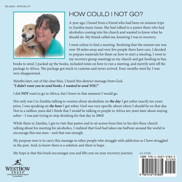 HOW COULD I NOT GO? A year ago, I heard from a friend who had been on mission trips to Zambia many times. She had talked to a pastor there who had alcoholics coming into his church and wanted to know what he should do. My friend called me, knowing I was in recovery. I went online to find a meeting. Realizing that the nearest one was over 50 miles away and very few people there have cars, I decided to prepare materials for them on how to start a meeting. I went to my recovery group meetings at my church and got funding to buy books to send. I packed up the books, included notes on how to run a meeting, and merrily sent off the package to Africa. The package got stuck in customs and never arrived. Four months went by. I was very disappointed. Months later, out of the clear blue, I heard this distinct message from God, "I didn’t want you to send books. I wanted to send YOU." I did NOT want to go to Africa, but I knew in that moment I would go. Not only was I in Zambia talking to women about alcoholism on the day I got sober exactly ten years prior, I was speaking on the hour I got sober. God was very specific about where I should be on that day. Not in a million years did I think that I would be talking to people in Africa ten years later about staying sober—I was just trying to stop drinking for that day in 2004! While there in Zambia, I got to visit that pastor and to sit across from him in his dirt-floor church talking about his meeting for alcoholics. I realized that God had taken me halfway around the world to encourage this one man—and that was enough. My purpose now is to carry this message to other people who struggle with addiction as I have struggled in the past. And, to know there is a solution and there is hope. My hope is that this book encourages you and lifts you on your recovery journey.