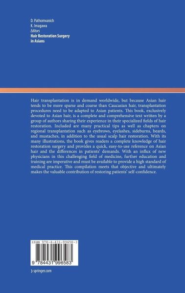 Hair transplantation is in demand worldwide, but because Asian hair tends to be more sparse and coarse than Caucasian hair, transplantation procedures need to be adapted to Asian patients. This book, exclusively devoted to Asian hair, is a complete and comprehensive text written by a group of authors sharing their experience in their specialized fields of hair restoration. Included are many practical tips as well as chapters on regional transplantation such as eyebrows, eyelashes, sideburns, beards, and mustaches, in addition to the usual scalp hair restoration. With its many illustrations, the book gives readers a complete knowledge of hair restoration surgery and provides a quick, easy-to-use reference on Asian hair and the differences in patients' demands. With an influx of new physicians in this challenging field of medicine, further education and training are imperative and must be available to provide a high standard of medical practice. This compilation meets that objective and ultimately makes the valuable contribution of restoring patients' self-confidence.
