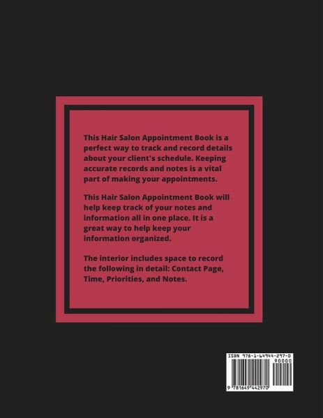 This hair salon appointment book is a perfect way to keep your appointments organized. The interior includes space to record the following: Contact Page - Write your contact info. Time - Starts at 7 am and ends at 9 pm in 15-minute increments. Priorities - Record anything you have going on that day that takes priority. Notes - Log any important client or customer that you don't want to forget, or anything that happened throughout the day. Easy to use and great to track and log your appointments. Appointment books and notebooks will keep your space neat and organized. Perfect for salons, barbers, hairdressers, spas, hair stylists, nails, and massage. Also makes a great gift. Get your copy today! Size is 8.5x11, 102 pages, undated, soft matte finish cover, white paper, paperback.