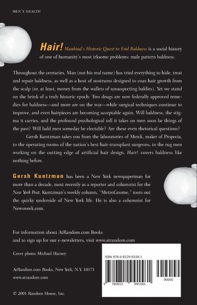 Hair! Mankind's Historic Quest to End Baldness is a social history of one of humanity's most irksome problems: male pattern baldness. Throughout the centuries, Man (not his real name) has tried everything to hide, treat and repair baldness, as well as a host of nostrums designed to coax hair growth from the scalp (or, at least, money from the wallets of unsuspecting baldies). Yet we stand on the brink of a truly historic epoch: Two drugs are now federally approved remedies for baldness and more are on the way while surgical techniques continue to improve, and even hairpieces are becoming acceptable again. Will baldness, the stigma it carries, and the profound psychological toll it takes on men soon be things of the past? Will bald men someday be electable? Are these even rhetorical questions? Gersh Kuntzman takes you from the laboratories of Merck, maker of Propecia, to the operating rooms of the nation's best hair-transplant surgeons, to the rug men working on the cutting edge of artificial hair design. Hair! covers baldness like nothing before.