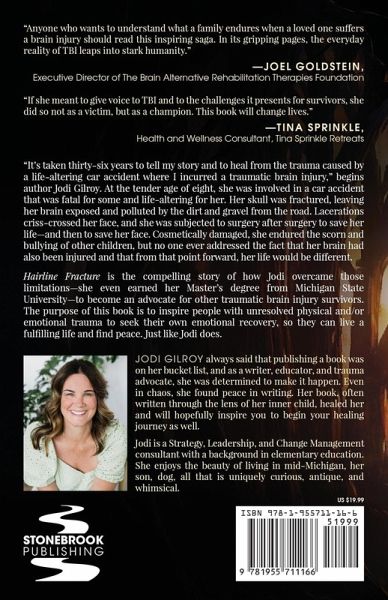 "It's taken thirty-six years to tell my story and to heal from the trauma caused by a life-altering car accident where I incurred a traumatic brain injury," begins author Jodi Gilroy. At the tender age of eight, she was involved in a car accident that was fatal for some and life-altering for her. Her skull was fractured, leaving her brain exposed and polluted by the dirt and gravel from the road. Lacerations criss-crossed her face, and she was subjected to surgery after surgery to save her life-and then to save her face. Cosmetically damaged, she endured the scorn and bullying of other children, but no one ever addressed the fact that her brain had also been injured and that from that point forward, her life would be different. Hairline Fracture is the compelling story of how Jodi overcame those limitations-she even earned her Master's degree from Michigan State University-to become an advocate for other traumatic brain injury survivors. The purpose of this book is to inspire people with unresolved physical and/or emotional trauma to seek their own emotional recovery, so they can live a fulfilling life and find peace. Just like Jodi does.