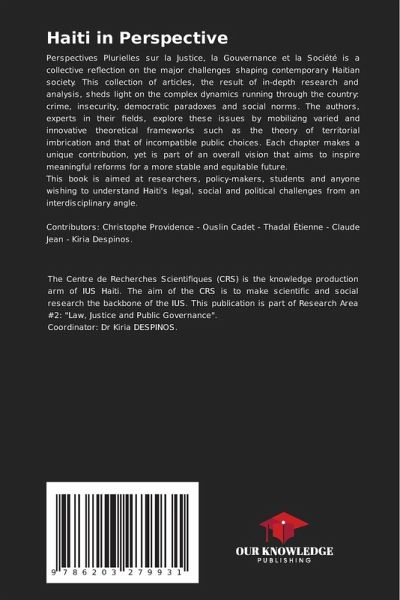 Perspectives Plurielles sur la Justice, la Gouvernance et la Société is a collective reflection on the major challenges shaping contemporary Haitian society. This collection of articles, the result of in-depth research and analysis, sheds light on the complex dynamics running through the country: crime, insecurity, democratic paradoxes and social norms. The authors, experts in their fields, explore these issues by mobilizing varied and innovative theoretical frameworks such as the theory of territorial imbrication and that of incompatible public choices. Each chapter makes a unique contribution, yet is part of an overall vision that aims to inspire meaningful reforms for a more stable and equitable future.This book is aimed at researchers, policy-makers, students and anyone wishing to understand Haiti's legal, social and political challenges from an interdisciplinary angle.Contributors: Christophe Providence - Ouslin Cadet - Thadal Étienne - Claude Jean - Kiria Despinos.