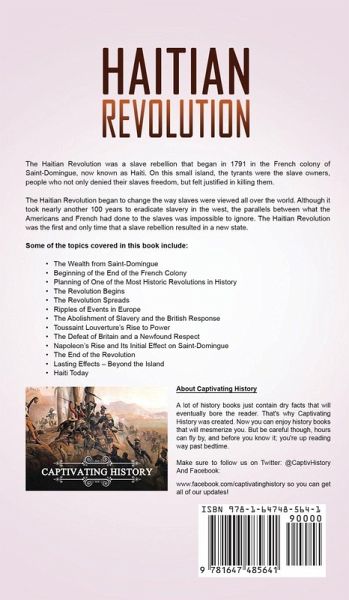 Explore How the Slaves Freed Themselves in the Haitian Revolution The Haitian Revolution was a slave rebellion that began in 1791 in the French colony of Saint-Domingue, now known as Haiti. On this small island, the tyrants were the slave owners, people who not only denied their slaves freedom, but felt justified in killing them. The Haitian Revolution began to change the way slaves were viewed all over the world. Although it took nearly another 100 years to eradicate slavery in the west, the parallels between what the Americans and French had done to the slaves was impossible to ignore. The Haitian Revolution was the first and only time that a slave rebellion resulted in a new state. Some of the topics covered in this book include: The Wealth from Saint-Domingue Beginning of the End of the French Colony Planning of One of the Most Historic Revolutions in History The Revolution Begins The Revolution Spreads Ripples of Events in Europe The Abolishment of Slavery and the British Response Toussaint Louverture’s Rise to Power The Defeat of Britain and a Newfound Respect Napoleon’s Rise and Its Initial Effect on Saint-Domingue The End of the Revolution Lasting Effects – Beyond the Island Haiti Today And much more! Scroll to the top and select the "Add to Cart" button to learn more about the Haitian Revolution!