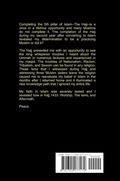 Completing the 5th pillar of Islam--the Hajj--is a once in a lifetime opportunity and many Muslims do not complete it. The completion of the Hajj in my second year after converting to Islam revealed my determination to be a practicing Muslim or did it? The Hajj presented me with an opportunity to see the long whispered troubles I heard about the Ummah in numerous lectures and experienced in the masjid. The troubles of Nationalism, Racism, Tribalism, and Sexism can be found in any religion. These isms that I witnessed during the Hajj and witnessing three Muslim sisters leaving the religion caused me to reevaluate my belief in Islam in the months after I returned home and it illuminated a new knowledge path that I ignored my entire life. My faith in Islam was severely tested and I revealed how in Hajj 1433: Worship, The Isms, and Aftermath.