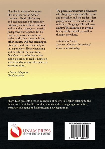Namibia is a land of contrasts like no other on the African continent. Hugh Ellis' poetry and accompanying photography brilliantly capture these contrasts, and how they manage to co-exist, juxtaposed, but together. Yet his poetry has resonance with the wider world, that someone in any other country will find meaning in his words, and take ownership of his experiences. Heart wrenching and hopeful at the same time, Hakahana is a collection to take along a journey, to read at home on a lazy Sunday, or any other place, at any other time. - Sheena Magenya, Gender activist The poems demonstrate a cleverness with language and especially rhyme and metaphor, and the reader is left paging forward to see what subtle twisting of language Ellis will next employ. The collection as a whole is very easily readable, as well as thought provoking. - Alexander Brewis, Lecturer, Namibia University of Science and Technology