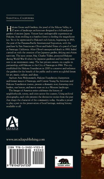 Hakone Estate and Gardens, the jewel of the Silicon Valley, is 17 acres of landscape architecture designed as a hill-and-pond garden of ancient Japan. Visitors have unforgettable experiences at Hakone, from strolling in a bamboo forest to feeding the magnificent koi. Yet to be appreciated is Hakone's rich history, beginning in 1915, the year of the Panama-Pacific International Exposition, with the purchase by San Franciscans Oliver and Isabel Stine of a parcel of land in Saratoga, California. After Oliver's unexpected death in 1918, Isabel carried on with the creation of her Japanese garden, defying anti-Asian nativism. The next owner, Maj. Charles Tilden, protected Hakone during World War II when the Japanese gardener and his family were sent to an internment camp. The last private owners, six couples in partnership, sold Hakone to the City of Saratoga in 1966. The city established the Hakone Foundation in 2000 to conserve and enhance the gardens for the benefit of the public and to serve as a global forum for art, music, culture, and ideas.