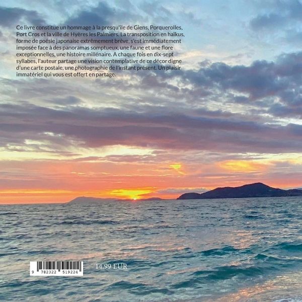 Ce livre constitue un hommage à la presqu'ile de Giens, Porquerolles, Port Cros et la ville de Hyères les Palmiers. La transposition en haïkus, forme de poésie japonaise extrêmement brève, s'est immédiatement imposée face à des panoramas somptueux, une faune et une flore exceptionnelles, une histoire millénaire. A chaque fois en dix-sept syllabes, l'auteur partage une vision contemplative de ce décor digne d'une carte postale, une photographie de l'instant présent. Un plaisir immatériel qui vous est offert en partage.