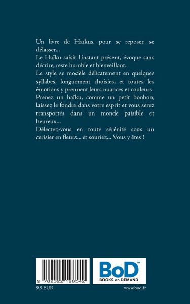 Un livre de Haïkus, pour se reposer, se délasser...L'Haïku saisit l'instant présent, évoque sans décrire, reste humble et bienveillant.Le style se modèle délicatement en quelques syllabes, longuement choisies, et toutes les émotions y prennent leurs nuances et couleursPrenez un haïku, comme un petit bonbon, laissez le fondre dans votre esprit et vous serez transportés dans un monde paisible et heureux...Délectez-vous en toute sérénité sous un cerisier en fleurs... et souriez... Vous y êtes !