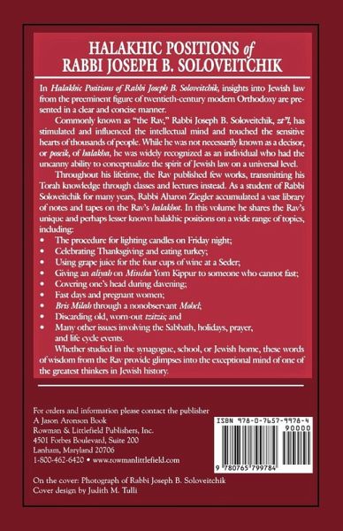 In Halakhic Positions of Rabbi Joseph B. Soloveitchik, insights into Jewish law from the preeminent figure of twentieth-century modern Orthodoxy are presented in a clear and concise manner. Commonly known as "the Rav," Rabbi Joseph B. Soloveitchik, zt"l, has stimulated and influenced the intellectual mind and touched the sensitive hearts of thousands of people. While he was not necessarily known as a decisor, or poseik, of halakha, he was widely recognized as an individual who had the uncanny ability to conceptualize the spirit of Jewish law on a universal level. Throughout his lifetime, the Rav published few works, transmitting his Torah knowledge through classes and lectures instead. As a student of Rabbi Soloveitchik for many years, Rabbi Aharon Ziegler accumulated a vast library of notes and tapes on the Rav's halakhot. In this volume he shares the Rav's unique and perhaps lesser known halakhic positions on a wide range of topics.