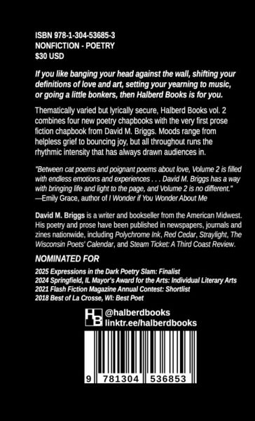 If you like banging your head against the wall, shifting your definitions of love and art, setting your yearning to music, or going a little bonkers, then Halberd Books is for you. Thematically varied but lyrically secure, Halberd Books vol. 2 combines four new poetry chapbooks with the very first prose fiction chapbook from David M. Briggs. Moods range from helpless grief to bouncing joy, but all throughout runs the rhythmic intensity that has always drawn audiences in.