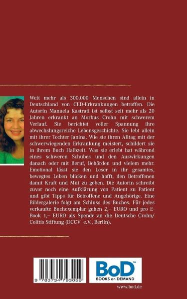 Weit mehr als 300.000 Menschen sind allein in Deutschland von CED-Erkrankungen betroffen. Die Autorin Manuela Kastrati ist selbst seit mehr als 20 Jahren erkrankt an Morbus Crohn mit schwerem Verlauf. Sie berichtet voller Spannung über ihre abwechslungsreiche Lebensgeschichte. Sie lebt allein mit ihrer Tochter Janina. Wie sie ihren Alltag mit der schwerwiegenden Erkrankung meistert, schildert sie in ihrem Buch Halbzeit. Was sie erlebt hat, während eines schweren Schubes und den Auswirkungen danach oder mit Beruf, Behörden und vielem mehr. Emotional lässt sie den Leser in ihr gesamtes, bewegtes Leben blicken und hofft, den Betroffenen damit Kraft und Mut zu geben. Die Autorin schreibt zuvor noch eine Aufklärung von Patient zu Patient über Morbus Crohn (CED-Erkrankungen) und gibt Tipps für Betroffene und Angehörige. Eine Bildergalerie folgt am Schluss des Buches. Für jedes verkaufte Buchexemplar gehen 2,-- EURO und pro E-Book 1,-- EURO als Spende an die Deutsche Crohn/Colitis Stiftung (DCCV e.V., Berlin).