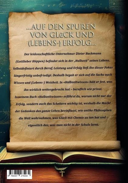 Der leidenschaftliche Unternehmer Dieter Bachmann (Gottlieber Hüppen) befindet sich in der "Halbzeit" seines Lebens. Selbstdefiniert durch Beruf, Leistung und Erfolg ließ ihn dieser Fokus längerfristig unbefriedigt. Deshalb begab er sich auf die Suche nach Wissen und (Lebens-) Weisheit. In «Halbzeitwissen» hält er fest, was ihn wirklich weitergebracht hat - beruflich wie privat. Nichts davon wurde ihm in der Schule vermittelt. In seinem Buch «Halbzeitwissen» erfährst du, warum nicht nur der Erfolg, sondern auch das Scheitern wichtig ist, weshalb die Macht der Gedanken das ganze Leben beeinflusst, wie antike Philosophen die Welt wahrnahmen, was Glück mit Chemie zu tun hat und - eigentlich das, was man nicht in der Schule lernt.