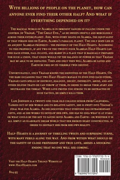 With billions of people on the planet, how can anyone ever find their other half? And what if everything depended on it? The magical world of Alamea is in imminent danger of falling under the control of Vranah, "The Great Evil," as he sweeps swiftly and mercilessly across their entire planet. And, with every death on Alamea, the equivalent of that person dies on Earth, Alamea's parallel planet. The only hope lies in an ancient Alamean prophecy- the prophecy of the Half-Hearts. According to this prophecy, if any two of the twenty-four Alamean Half-Hearts can find each other, fall in love, and marry in a place that is magically prepared for such a union, that union would tip the balance of power so that Vranah may be able to be defeated. Then and only then will Alamea be saved and Earth be free of its terrible twin destiny. Unfortunately, only Vranah knows the identities of the Half-Hearts. On the rare occasions that two Half-Hearts manage to even find each other, Vranah casts spells of distrust, jealousy, deceit, infidelity, abuse, and any other selfish traits he can throw at them, in order to break them apart and neutralize the threat. When love proves too strong to be distracted by such tactics, he simply kills them. Lani Johnson is a twenty-one-year-old college senior from California. Yanked out of her world and its relative safety, she is swept into Vranah's final war for Alamea. As she discovers that everyone has extraordinary gifts, and as she works to develop her own, she has no idea what is at stake or what could be the key to saving both Alamea and Earth- or whether it is all simply an elaborate dream world that her broken heart constructed, in order to distract her from her own reality. Half-Hearts is a journey of thrilling twists and surprising turns, with many perils along the way. And from within what should be the safety of close friendship and true love, arises a shocking ending that no one will see coming.