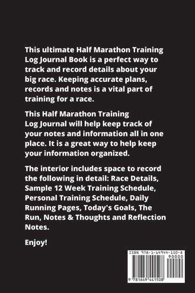 This undated Half Marathon Training Journal logbook is a perfect way to help runners track progress as they train for that big race. This 12 week planner, diary can help you keep all your important data all in one place. We all know every runner loves to journal everything, as it's a great way to set goals, keeping you accountable and feel accomplished. Journaling your run workout and fitness exercise is key and an important part of your training. The interior includes space to record the following: Race Details - Write Race Training for, Date of the Race, Date Registration Due, Entry Fee, Date to Start Training, Training & Race Goals. Sample 12 Week Training Schedule - Gives you an example of what your training schedule could look like. Personal Training Schedule - Write your own Personal Training Schedule to fit your own training needs. Daily Running Pages - 12 Weeks (3 months) of Daily Running pages. Write date and day until the race. Today's Goals - Record your Goals for the day including Distance, Speed & Other. The Run - Prompts for writing Route, Weather Conditions, Start Time, End Time, Total Time, Total Distance and Average Pace. Notes & Thoughts - Blank lined notes and personal thoughts for writing any other info you will want to write such as asthma condition, tracking soreness, favorite inspirational quote, results, etc. Reflection Notes - Space to look back and reflect on what worked, anything you need to stop doing or do less of, what you think you need to do more of next time, what you worry about, did you get better or see improvements, etc. Simple & easy to use. Makes a great gift for that special runner in your life who love to train for a half marathon. Logs & notebooks are a convenient way to keep all your important information all in one place. Buy & get your copy now! Running design. Size is 6x9 inches (easy to take with you), 76 pages, white paper, black ink, soft matte finish cover, paperback.