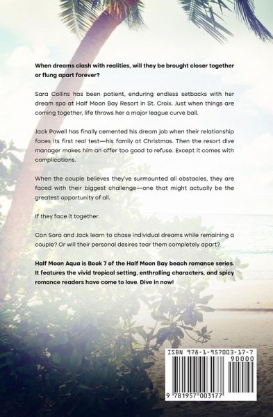 When dreams clash with realities, will they be brought closer together or flung apart forever? Sara Collins has been patient, enduring endless setbacks with her dream spa at Half Moon Bay Resort in St. Croix. Just when things are coming together, life throws her a major league curve ball. Jack Powell has finally cemented his dream job when their relationship faces its first real test-his family at Christmas. Then the resort dive manager makes him an offer too good to refuse. Except it comes with complications. When the couple believes they've surmounted all obstacles, they are faced with their biggest challenge-one that might actually be the greatest opportunity of all. If they face it together. Can Sara and Jack learn to chase individual dreams while remaining a couple? Or will their personal desires tear them completely apart? Half Moon Aqua is Book 7 of the Half Moon Bay beach romance series. It features the vivid tropical setting, enthralling characters, and spicy romance readers have come to love. Dive in now!
