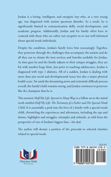 Jordan is a loving, intelligent, and energetic boy who, at a very young age, was diagnosed with autism spectrum disorder. As a result, he is significantly limited in communication skills, social development, and academic progress. Additionally, Jordan and his family sometimes have to contend with those who are either not receptive to or not well-informed about special-needs individuals. Despite his condition, Jordan's family loves him unceasingly. Together, they persevere through the challenges that accompany the autism and do all they can to obtain the best services and benefits available for Jordan. As time goes by and the family adjusts to their unique struggles, they are hit with another huge blow. Just prior to reaching adolescence, Jordan is diagnosed with type 1 diabetes. All of a sudden, Jordan is dealing with more than just social and developmental issues but also a major physical health scare. Yet amid the devastating news and extremely difficult process overall, the family's faith remains strong, and Jordan continues to persevere like the champion that he is. This memoir Half My Life: Special in Many Ways is a follow on to the initial work entitled Half My Life: The Testimony of a Father and His Special-Needs Child. It is essentially a peek into the lives of a family with a special-needs child, chronicling the experiences and adventures, including the ups and downs, highlights and struggles, triumphs and setbacks, as told from the perspective of one of Jordan's biggest fans--his dad. The author will donate a portion of the proceeds to selected charities related to special needs.