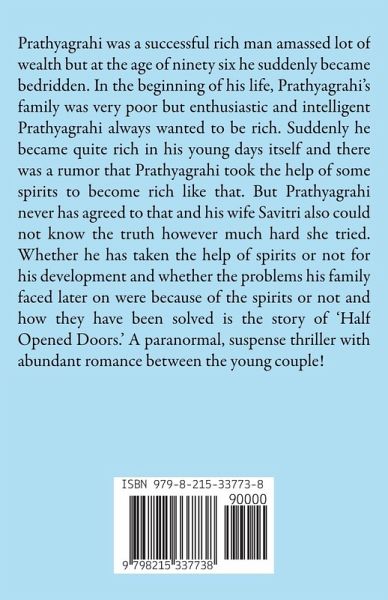 Prathyagrahi was a successful rich man amassed lot of wealth but at the age of ninety six he suddenly became bedridden. In the beginning of his life, Prathyagrahi's family was very poor but enthusiastic and intelligent Prathyagrahi always wanted to be rich. Suddenly he became quite rich in his young days itself and there was a rumor that Prathyagrahi took the help of some spirits to become rich like that. But Prathyagrahi never has agreed to that and his wife Savitri also could not know the truth however much hard she tried. Whether he has taken the help of spirits or not for his development and whether the problems his family faced later on were because of the spirits or not and how they have been solved is the story of 'Half Opened Doors.' A paranormal, suspense thriller with abundant romance between the young couple!