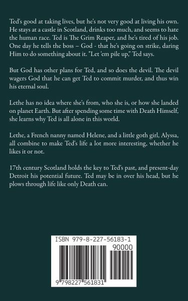 Ted's good at taking lives, but he's not very good at living his own. He stays at a castle in Scotland, drinks too much, and seems to hate the human race. Ted is The Grim Reaper, and he's tired of his job. One day he tells the boss - God - that he's going on strike, daring Him to do something about it. "Let 'em pile up," Ted says. But God has other plans for Ted, and so does the devil. The devil wagers God that he can get Ted to commit murder, and thus win his eternal soul. Lethe has no idea where she's from, who she is, or how she landed on planet Earth. But after spending some time with Death Himself, she learns why Ted is all alone in this world. Lethe, a French nanny named Helene, and a little goth girl, Alyssa, all combine to make Ted's life a lot more interesting, whether he likes it or not. 17th century Scotland holds the key to Ted's past, and present-day Detroit his potential future. Ted may be in over his head, but he plows through life like only Death can.