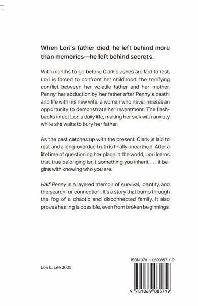Finalist! 2025 Next Generation Indie Book Awards, Women's Nonfiction Half Penny is a deeply intimate memoir that unearths the buried truths of a fractured childhood shaped by secrecy, loss, and the longing for connection. In the wake of her father's death, Lori is pulled into a reckoning: not only with the volatile man he was, but with the lies he took to his grave. What begins as a daughter's attempt to lay her father to rest becomes a harrowing excavation of her earliest memories: her mother's early death, her own childhood abduction, and the quiet violence of being raised in a home where loyalty meant silence. Told in sharp, lyrical prose, Half Penny examines the emotional cost of survival and the courage it takes to face the past. Unflinching yet compassionate, Half Penny invites readers into the heart of a girl growing up amid chaos, and the woman who must piece herself back together to reclaim her voice. Fans of memoirs like Troubled (Rob K Henderson) and The Glass Castle (Jeanette Walls) will find familiar emotional terrain in this true story of deception, survival, and identity lost and found. Perfect for readers who: -look for true stories -are drawn to emotional and unforgettable narratives -want to be inspired by courageous accounts of resilience and survival -need a selection for their book club -enjoy accessible stories