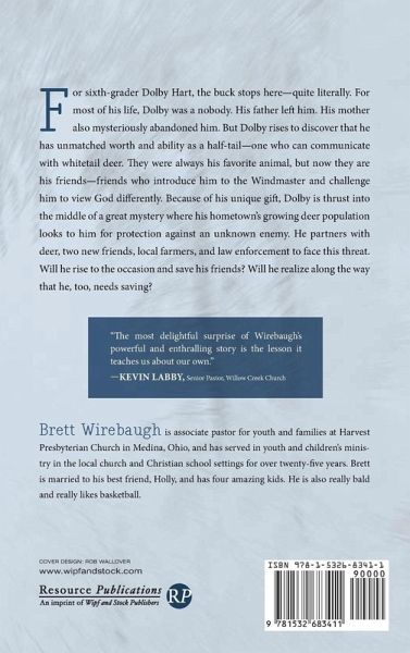For sixth-grader Dolby Hart, the buck stops here--quite literally. For most of his life, Dolby was a nobody. His father left him. His mother also mysteriously abandoned him. But Dolby rises to discover that he has unmatched worth and ability as a half-tail--one who can communicate with whitetail deer. They were always his favorite animal, but now they are his friends--friends who introduce him to the Windmaster and challenge him to view God differently. Because of his unique gift, Dolby is thrust into the middle of a great mystery where his hometown's growing deer population looks to him for protection against an unknown enemy. He partners with deer, two new friends, local farmers, and law enforcement to face this threat. Will he rise to the occasion and save his friends? Will he realize along the way that he, too, needs saving?