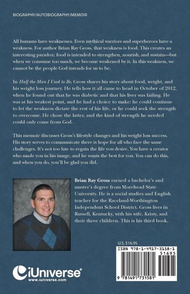 All humans have weaknesses. Even mythical warriors and superheroes have a weakness. For author Brian Ray Gross, that weakness is food. This creates an interesting paradox: food is intended to strengthen, nourish, and sustain-but when we consume too much, we become weakened by it. In this weakness, we cannot be the people God intends for us to be. In Half the Man I Used to Be, Gross shares his story about food, weight, and his weight loss journey. He tells how it all came to head in October of 2012, when he found out that he was diabetic and that his liver was failing. He was at his weakest point, and he had a choice to make: he could continue to let the weakness dictate the rest of his life, or he could seek the strength to overcome. He chose the latter, and the kind of strength he needed could only come from God. This memoir discusses Gross's lifestyle changes and his weight loss success. His story serves to communicate there is hope for all who face the same challenges. It's not too late to regain the life you desire. You have a creator who made you in his image, and he wants the best for you. You can do this, and when you do, you'll be glad you did.